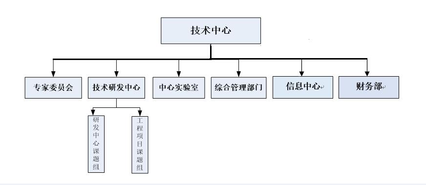 技術中心成立于2016年1月1日,在技術中心負責人帶領下,已經(jīng)形成一支技術雄厚、學歷層次合理、梯隊科學、朝氣蓬勃、凝聚力強的創(chuàng)新團隊。目前下設技術研發(fā)中心、中心實驗室、信息中心、財務部及綜合辦公室等五個主要職能部門,并聘請企業(yè)外的專家組成專家委員會。技術中心的組織架構如下所示: