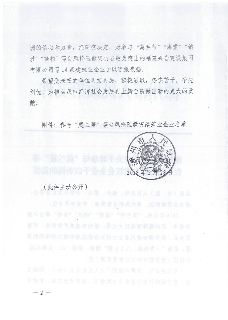 近日,漳州市人民政府發(fā)文,對參與 “莫蘭蒂”等臺風搶險救災建筑企業(yè)予以通報表揚,我集團在搶險救災中貢獻較為突出名列其中,為集團在信用評價體系獲得了加分機會,這是我集團贏得的一項新榮譽。