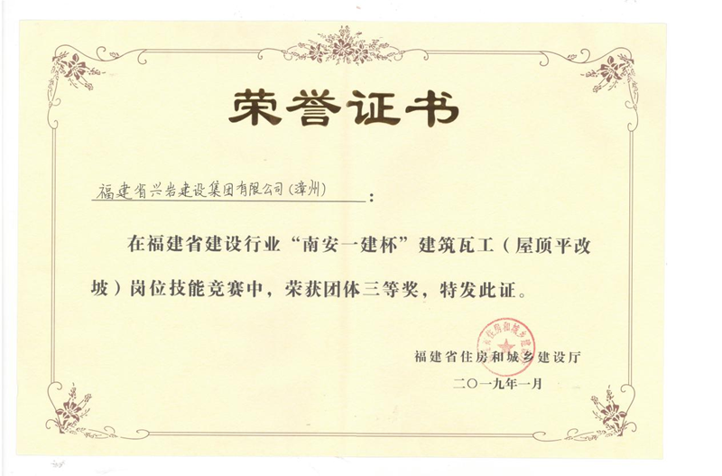 2019年1月23日,為期12天的福建省建設(shè)行業(yè)建筑瓦工(屋頂平改坡)崗位技能競(jìng)賽在南安閉幕。我集團(tuán)代表隊(duì)經(jīng)過(guò)賽前賽后精心設(shè)計(jì)和籌劃,在全省31個(gè)企業(yè)團(tuán)隊(duì)中脫穎而出,喜獲團(tuán)體三等獎(jiǎng)。