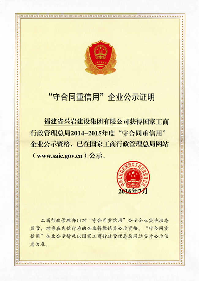 興巖集團被國家工商總局評為2014~2015年度全國“守合同重信用”單位。