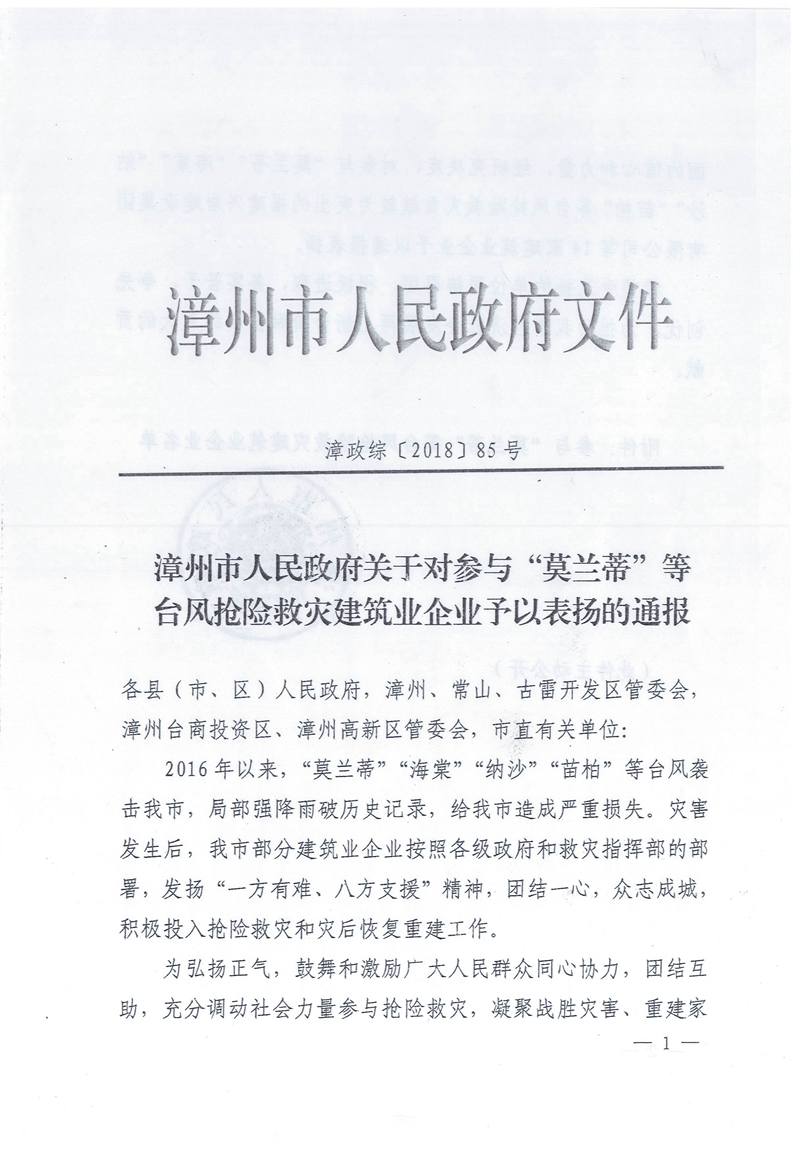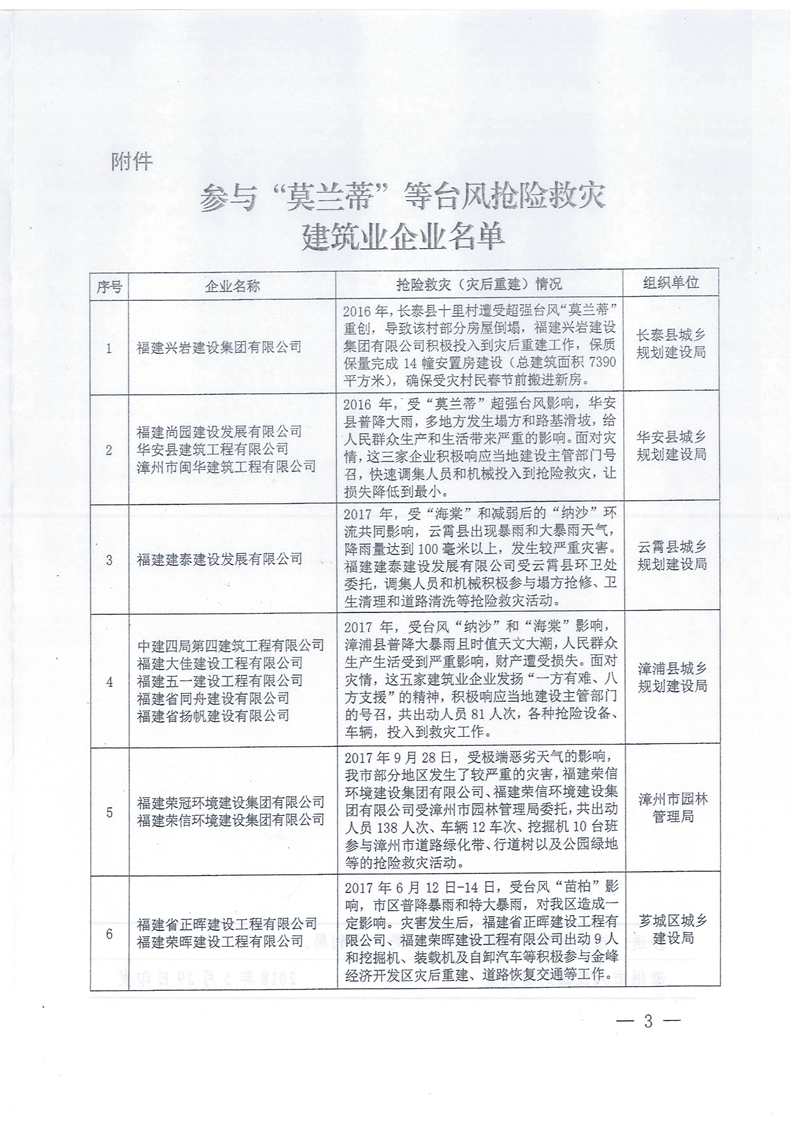近日,漳州市人民政府發(fā)文,對參與 “莫蘭蒂”等臺風搶險救災建筑企業(yè)予以通報表揚,我集團在搶險救災中貢獻較為突出名列其中,為集團在信用評價體系獲得了加分機會,這是我集團贏得的一項新榮譽。