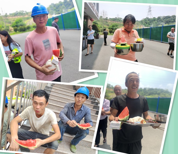 認(rèn)真做好防暑降溫工作,切實(shí)保障高溫下一線職工的職業(yè)安全與健康權(quán)益,科技廠副總經(jīng)理陳海彬、廠長(zhǎng)林江鵬、副廠長(zhǎng)胡智強(qiáng),科研樓副總工曾華溢、項(xiàng)目經(jīng)理葉阿聰。平日里不茍言笑的主管,平日里正言厲色的領(lǐng)導(dǎo),今日收起了領(lǐng)導(dǎo)光環(huán),為自己的員工精心準(zhǔn)備了冰鎮(zhèn)西瓜及涼茶。早早的在餐廳門口等候,等待辛苦的砼人們?cè)谟猛瓴偷牡谝粫r(shí)間為他們親手遞上清涼與問(wèn)候。促進(jìn)了上下級(jí)關(guān)系的和諧,體現(xiàn)公司“家”文化的企業(yè)理念,進(jìn)一步形成良好的企業(yè)向心力和凝聚力。